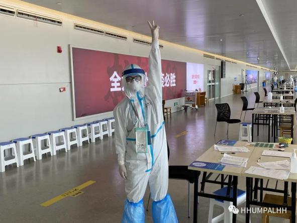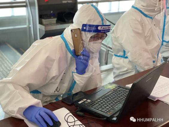 图为:张珺和同事用镜头记录下抗疫点滴 图为:张珺身着防护服等待航班降落