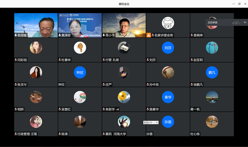 7月30日,“应急管理与国家治理现代化”云端系列名家讲堂第三讲如期举行。中国行政管理学会政府绩效管理研究会会长、国务院应急管理专家组成员、国家森林防火指挥部专家组成员、国家社科基金重大项目“国家治理现代化与行政管理制度创新研究”首席专家高小平研究员以《中国应急管理制度优势及实现路径》为题,为河海师生带来了一场精彩的学术报告。南京大学社会风险与公共危机管理研究中心主任、太阳成城集团tyc234cc“河海学者”讲座教授童星特邀点评。太阳成tyc234cc院长黄涛珍教授主持报告会。200余名师生认真聆听了报告。
