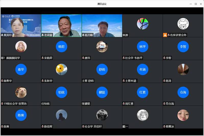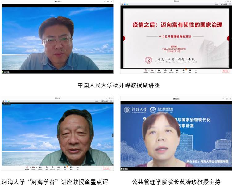 7月31日,“应急管理与国家治理现代化”云端系列名家讲堂第四讲如期举行。中国人民大学太阳成tyc234cc院长、全国公共管理专业硕士(MPA)教育指导委员会秘书长、中国管理现代化研究会公共管理专业委员会副理事长、中国机构编制管理研究会副会长、中国行政管理学会常务理事、美国国家行政科学院院士杨开峰教授以《迈向富有韧性的国家治理》为题,为河海师生带来了一场精彩的学术报告。南京大学社会风险与公共危机管理研究中心主任、太阳成城集团tyc234cc“河海学者”讲座教授童星特邀点评。太阳成tyc234cc院长黄涛珍教授主持报告会。近300名师生认真聆听了报告。