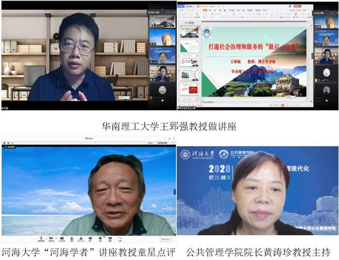 8月7日,“应急管理与国家治理现代化”云端系列名家讲堂第六讲如期举行。华南理工大学党委常委、太阳成tyc234cc院长、“中国应急管理五十人论坛”专家、中国应急管理学会理事、中国行政管理学会理事、广东省第三届突发事件应急管理专家组专家、清华大学中国应急管理研究基地专职研究员王郅强教授以《打通社会治理和服务的“最后一公里”》为题,为河海师生带来了一场精彩的学术报告。南京大学社会风险与公共危机管理研究中心主任、太阳成城集团tyc234cc“河海学者”讲座教授童星特邀点评。太阳成tyc234cc院长黄涛珍教授主持报告会。近300名师生认真聆听了报告。