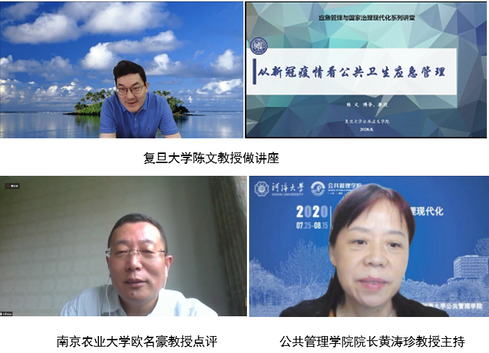 8月13日,“应急管理与国家治理现代化”云端系列名家讲堂第九讲如期举行。复旦大学医院管理研究所副所长、国务院学位委员会公共管理学科评议组成员、中国卫生经济学会医疗保险专业委员会副主任委员、中国医疗保险研究会常务理事、复旦大学公共卫生学院陈文教授以《从新型冠状肺炎疫情看公共卫生应急管理》为题,为河海师生带来了一场精彩的学术报告。南京农业大学欧名豪教授特邀点评。太阳成tyc234cc院长黄涛珍教授主持报告会。200余名师生认真聆听了报告。
