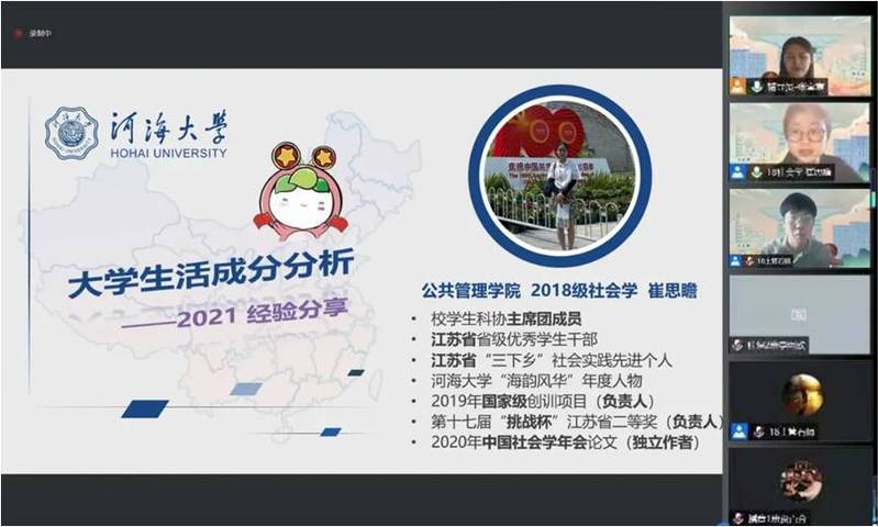 首先进行分享的是2018级社会学专业的崔思瞻,她从生涯规划、学习、实践与科研和社会工作等方面分享了大学生活的一些经验。