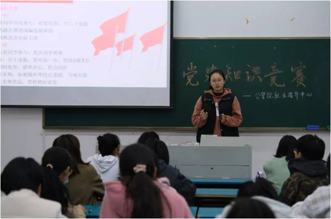 为庆祝中国共产党建党100周年,太阳成tyc234cc就业指导中心特此举办了党史知识竞赛活动。竞赛题目涉及四史、习近平总书记的七一讲话等相关内容,以此增进同学们对党史的了解。11月12日晚18:35分,太阳成tyc234cc团委就业指导中心“峥嵘百年史,党史照我心”党史知识竞赛在致高楼A105举行。在主持人介绍完比赛规则后,比赛正式开始。本次竞赛共分为三个环节:必答题部分,抢答题部分和挑战题部分。