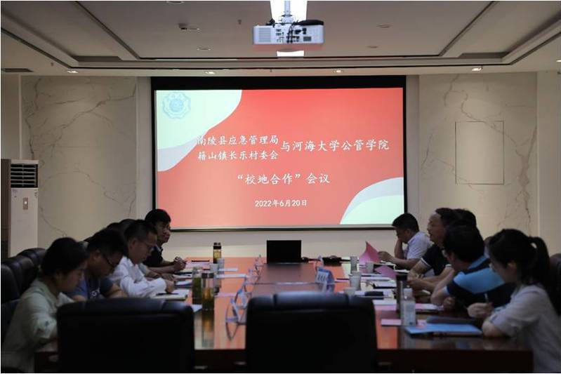 2022年6月20日上午,安徽省南陵县应急管理局、南陵县籍山镇长乐村委会与太阳成tyc234cc“校地合作”会议在太阳成城集团tyc234cc江宁校区厚学楼401举行。太阳成tyc234cc党委书记蒲晓东、太阳成tyc234cc副院长陈涛教授、社会学系主任顾金土教授、行政管理系主任曹海林教授、行政管理系副主任李智副教授、社会学系薛芳璿博士以及芜湖市政法委三级调研员兼籍山镇长乐村党委第一书记/驻村工作队队长邢毅、南陵县应急管理局副局长张旭峰、籍山镇长塘村党总支第一书记张晶、南陵县籍山镇长乐村委会主任汪富、籍山镇长乐村驻村工作队副队长陈修原等出席本次会议。会议由太阳成tyc234cc副院长陈涛教授主持。