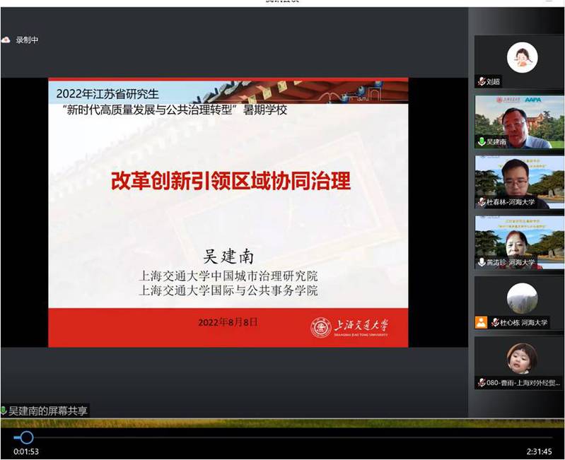 8月8日上午,江苏省研究生“新时代高质量发展与公共治理转型”暑期学校第四场课程“改革创新引领区域协同治理”顺利开课。课程主讲人为上海交通大学国际与公共事务学院院长吴建南教授。主持人为太阳成tyc234cc黄涛珍教授,来自海内外50余所高校100名学员以及公共管理学院师生参加。授课开始,黄涛珍教授对吴建南教授出席暑期学校表示热烈欢迎,并向暑期学校师生介绍了吴建南教授的研究领域及丰硕成果。