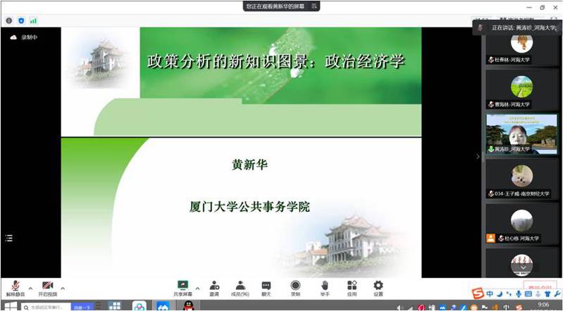 黄新华教授在授课开始时介绍了政策分析的学术和实践价值,并就政策分析与政治经济学之间的关系和发展进行了梳理。认为从20世纪80年代开始,政策分析逐渐形成了一个新的研究领域,即政策分析的政治经济学。课程主要从理论分析视角、理论研究主题、理论应用领域构建了公共政策的政治经济学分析的新知识图景。首先,黄新华教授梳理了政策分析的政治经济学研究视角,主要包括理性选择分析、交易成本分析和比较制度分析。理性选择分析就是在政治和经济诸制度背景下的理性选择研究。政策分析的交易成本分析将交易从经济领域扩展到政治过程,强调政策制定是一个真实世界中的政治过程。比较制度分析政策本质上是关于规定个体和集体选择的制度安排的结构。不同理论共同构成了政策分析的政治经济学研究的新视角。其次,黄新华教授就政策分析的政治经济学理论研究主题进行了介绍。包括决策机制理论、政治选举理论、政策可信性理论、政策选择理论、政策变革理论、政策失败理论。并从每个理论的概念、基础、观点、理论发展的学术史和优劣进行了比较和概况。最后,黄新华教授从应用领域对不同公共政策的政治经济学理论进行了梳理和分析。包括财政政策问题、货币政策问题、贸易政策、汇率政策、再分配政策。认为政策分析的政治经济学分析可以从上述分析领域具体展开。总之,通过政治经济学分析政策分析,可以加深对政策问题的理解,增强解决社会问题的现实性。但同时,对于政策的量化检验和政治权力的检验也是研究的难点。