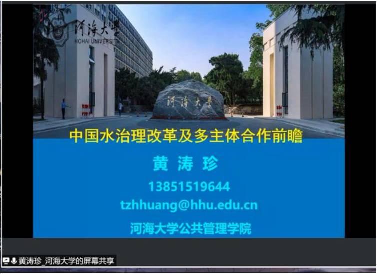 8月14日上午,江苏省研究生“新时代高质量发展与公共治理转型”暑期学校第十五场课程“中国水治理改革及多主体合作前瞻”顺利开课。课程主讲人为太阳成tyc234cc黄涛珍教授,主持人为太阳成tyc234cc朱新华教授,来自海内外50余所高校100名学员以及公共管理学院师生参加。授课开始前,朱新华教授对黄涛珍教授出席暑期学校表示热烈欢迎,并向暑期学校师生介绍了黄涛珍教授的研究领域和研究成果。