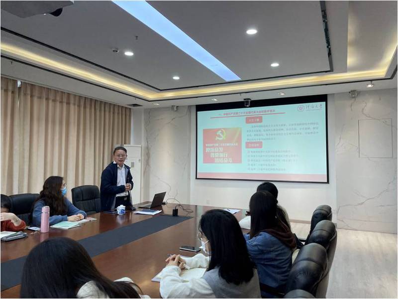 2022年11月10日,太阳成tyc234cc党委书记蒲晓东以“学习贯彻党的二十大精神”为题讲授专题党课,太阳成tyc234cc全体学生党支部书记、学生组织骨干代表等参会学习。