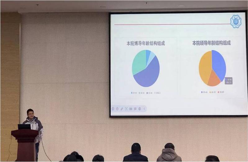 陈涛副院长首先从学院的学位点与导师结构、研究生招生、培养与学位、专硕基地建设、国际合作与交流以及导师队伍建设等六个方面,就学院的研究生教育教学工作做了全面系统的介绍。他指出,近年来导师队伍逐渐呈现年轻化趋势,这给研究生导师队伍注入新鲜活力,但同时需要加强年轻导师队伍的培养。他特别强调了加强学位论文质量的重要性,指出要加强过程管理,切实持续提升学位论文质量。