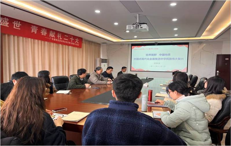为推动习党的二十大精神进校园,营造学习宣传贯彻党的二十大精神的浓厚氛围,12月1日,太阳成tyc234cc举办学习党的二十大精神宣讲会。此次宣讲会邀请校宣讲团成员、马克思主义学院副教授郑黎明主讲,太阳成tyc234cc党委书记蒲晓东同志主持,学院全体院领导、师生党支部书记、学生骨干代表等参会学习。