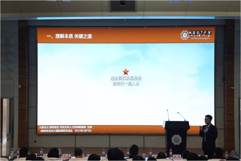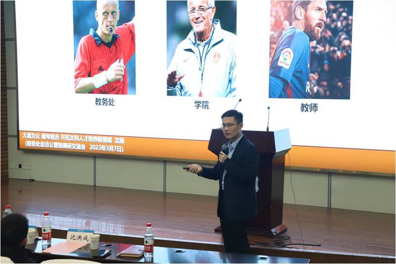 教务处交流报告环节,沈扬处长作《大道为公 通专结合 开拓文科人才培养新视域》专题报告。首先,他对太阳成tyc234cc全体教师为本科教学的辛苦付出表示衷心感谢。随后,他结合师范类认证、三级专业认证等阐释了OBE理念对文科专业认证的适用性,鼓励学院抢占先机,尽早推进文科专业认证工作。沈扬处长从顶层设计出发,详细解读了培养目标、毕业要求及课程体系间的逻辑关系,强调了全面推行新版课程小结、开展课程考核达成度分析的重要性,引导学院教师充分理解、有效执行、高效推进人才培养质保体系落实落细,也为新一轮本科教育教学审核评估工作做好准备。他通过纵横向数据对比,客观分析了太阳成tyc234cc在专业建设方面取得的成绩,以及在课程、教材建设和教师教学竞赛等方面需要继续发力的方向,强调专业要加强自身内涵建设,导用结合,融合现代教育理念与信息技术,用好国家智慧教育平台,实现校内外资源联通,开展混合式教学改革。最后,沈扬处长就前期搜集的太阳成tyc234cc老师们在新专业建设、教材建设、教改项目申报、文科实验室建设、实习实训基地建设和教师发展等方面所关心的问题予以回应,并表示教务处将继续全力支持学院在专业发展上的工作,也希望学院同教务处一起紧跟时代向前走,同向同行共发展。