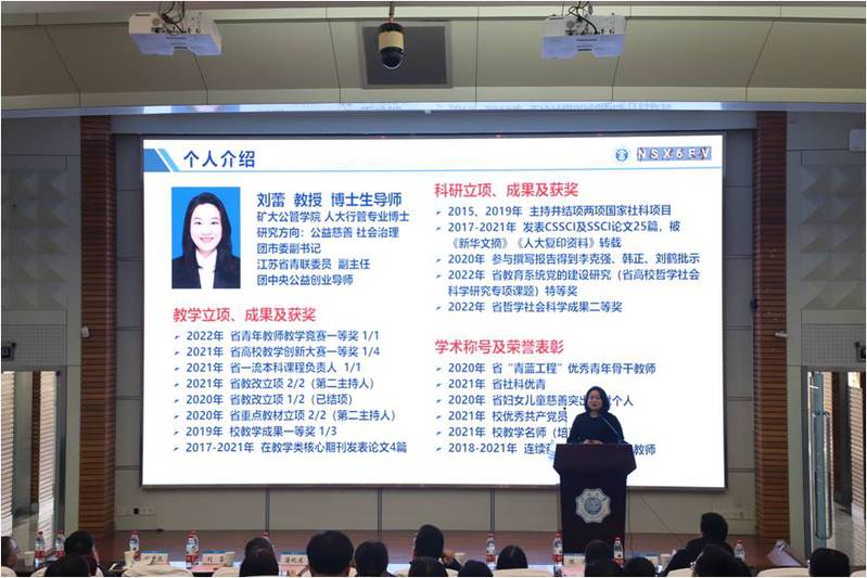 优秀课程建设案例分享环节,第四届全省高校青年教师教学竞赛一等奖、第三届江苏省高校教师教学创新大赛一等奖获得者中国矿业大学刘蕾教授作《公益引领 知思行践 并联式培养——<社会组织管理>课程创新与实践》经验分享。她从课程概况、学情分析与教学痛点、创新理念与创新举措,以及创新成果四个方面展开介绍,通过学情分析发现教学痛点问题,开展指向学生公共服务能力提升的情景化课程设计,在课程理念、教学目标、课程内容、课程模式、教学资源、教学方法、教学评价等多方面开展探索创新并取得了一系列教学成果。最后,刘蕾教授结合自身课程建设和教学竞赛方面的经历总结的“不怕累、不怕讲、不怕输、不怕做”“四不怕”精神,鼓励青年教师以学生发展为中心,不忘初心,砥砺前行。