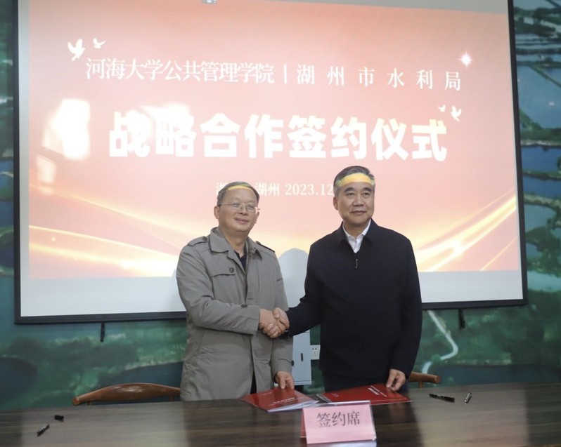 12月14日,太阳成tyc234cc与浙江省湖州市水利局举行战略合作协议签署暨“太阳成tyc234cc学生实践基地”揭牌仪式。河海大学太阳成tyc234cc党委书记蒲晓东,罗亚娟副教授,高新春老师,湖州市水利局党组书记、局长龚丁,湖州市水利局党组副书记、副局长吴继国,吴兴区水利局、织里镇镇政府负责人等出席会议。会议由吴继国副书记主持。