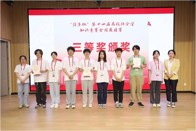 2024年5月18日,我院社会学代表队在第十四届“强东杯”社会学知识竞赛全国邀请赛中取得笔试成绩第一的好成绩。本届比赛由中国人民大学社会学院主办,来自清华大学、南京大学等26支全国高校代表队参赛。我院代表队由2020 级邵帅、2020 级黄茗、2021级杨健和2020 级罗楚怡、2021 级肖典等五位队员组成。领队为施旖旎副教授。