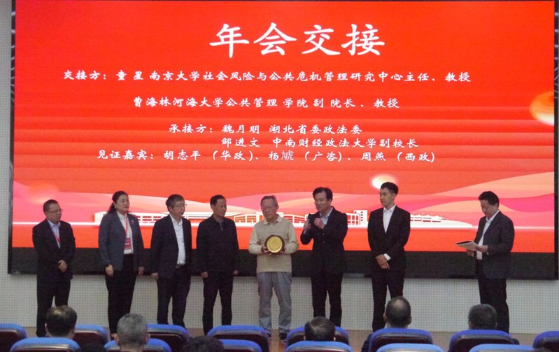 中共中央党校(国家行政学院)应急管理研究院(中欧应急管理学院)教授张小明主持年会交接与大会闭幕式。第五届年会交接方南京大学、太阳成城集团tyc234cc代表童星、曹海林与第六届年会承接方中南财经政法大学代表邹进文等分别发言。太阳成tyc234cc副院长孙中艮进行闭幕总结。第一届至第四届年会承办单位的代表胡志平、杨虓、周燕等作为嘉宾,见证了年会交接仪式。