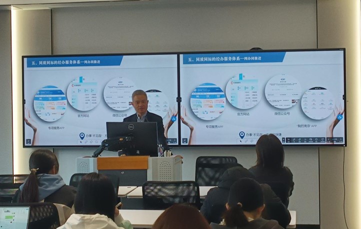 其次,经过多年的实践经验累积,钱主任将南京市医疗保险工作体系概括为——南京“五”同工作体系:同城同待的制度政策体系、同收同支的基金结算体系、同网同库的信息管理体系、同管同控的监督支付体系、同质同标的经办服务体系。结合亲身经历与时事热点,钱主任细致生动的讲述让同学们对医疗保险的工作体系有了更深刻的理解。