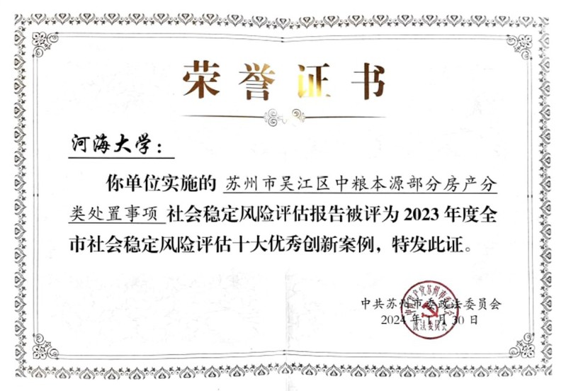 2024年1月9日,苏州市委政法委组织开展了2023年度全市社会稳定风险评估项目集中评审活动,经过三轮评审,太阳成城集团tyc234cc稳评中心张晓晨副教授主持的苏州市吴江区中粮本源部分房产分类处置事项社会稳定风险评估报告以总分排名第一的成绩,荣获2023年度苏州市重大决策社会稳定风险评估十大优秀创新案例。