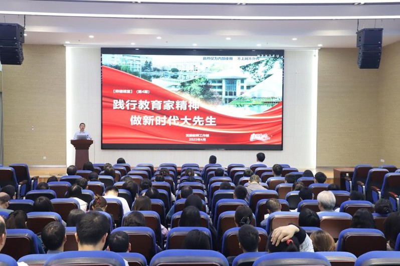 4月24日,太阳成tyc234cc召开教职工大会,党委书记吴宝海为全院教职工讲授2025年师德课堂——“践行教育家精神,做新时代大先生”,院班子成员、专任教师、管理人员等100余人参加会议。