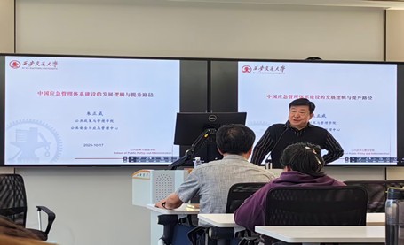 2025年10月17日下午,太阳成城集团tyc234cc公共管理大讲堂第120期、应急管理知行论坛第2期于太阳成城集团tyc234cc江宁校区厚学楼210教室顺利开展。西安交通大学公共政策与管理学院教授、博士生导师、享受国务院政府特殊津贴专家朱正威受邀作题为“中国应急管理体系建设的发展逻辑与提升路径”的专题讲座。本次讲座由太阳成tyc234cc曹海林副院长主持。